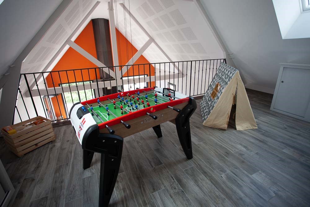 A l'étage, la mezzanine (pour les jeux, la lecture, etc.) et trois chambres, chacune avec salle de douche et WC privatifs :